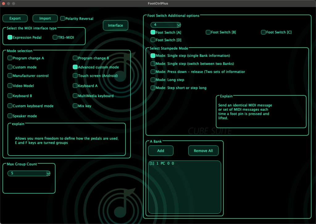 - PC App: Everything is visible on one screen for a fast overview. To configure an expression pedal, click the ”Interface” button at the top and ensure the type is set to Expression Pedal.